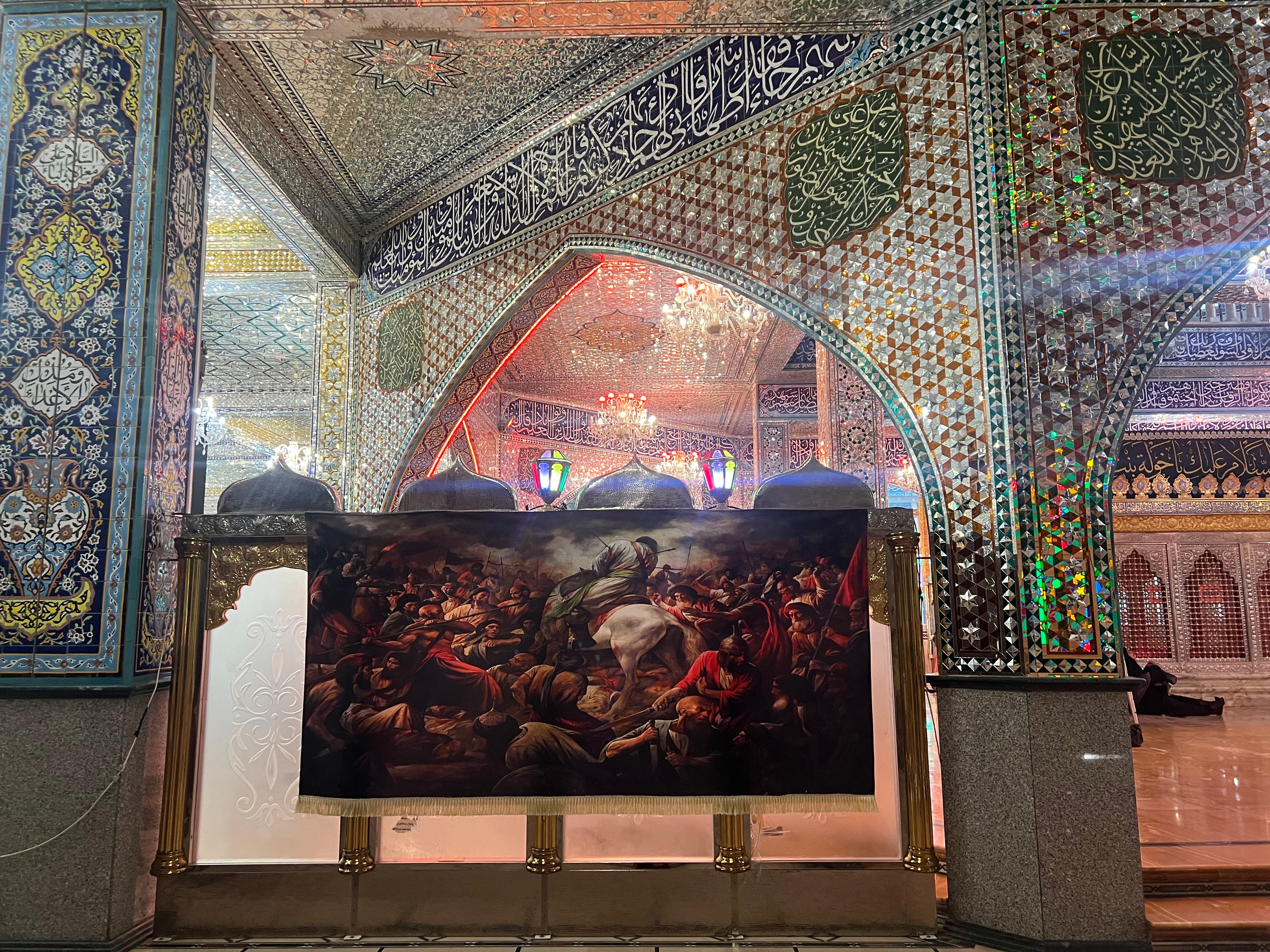 A Renaissance style oil painting print of a crusader being killed by muslim armies hangs on the mosque wall.