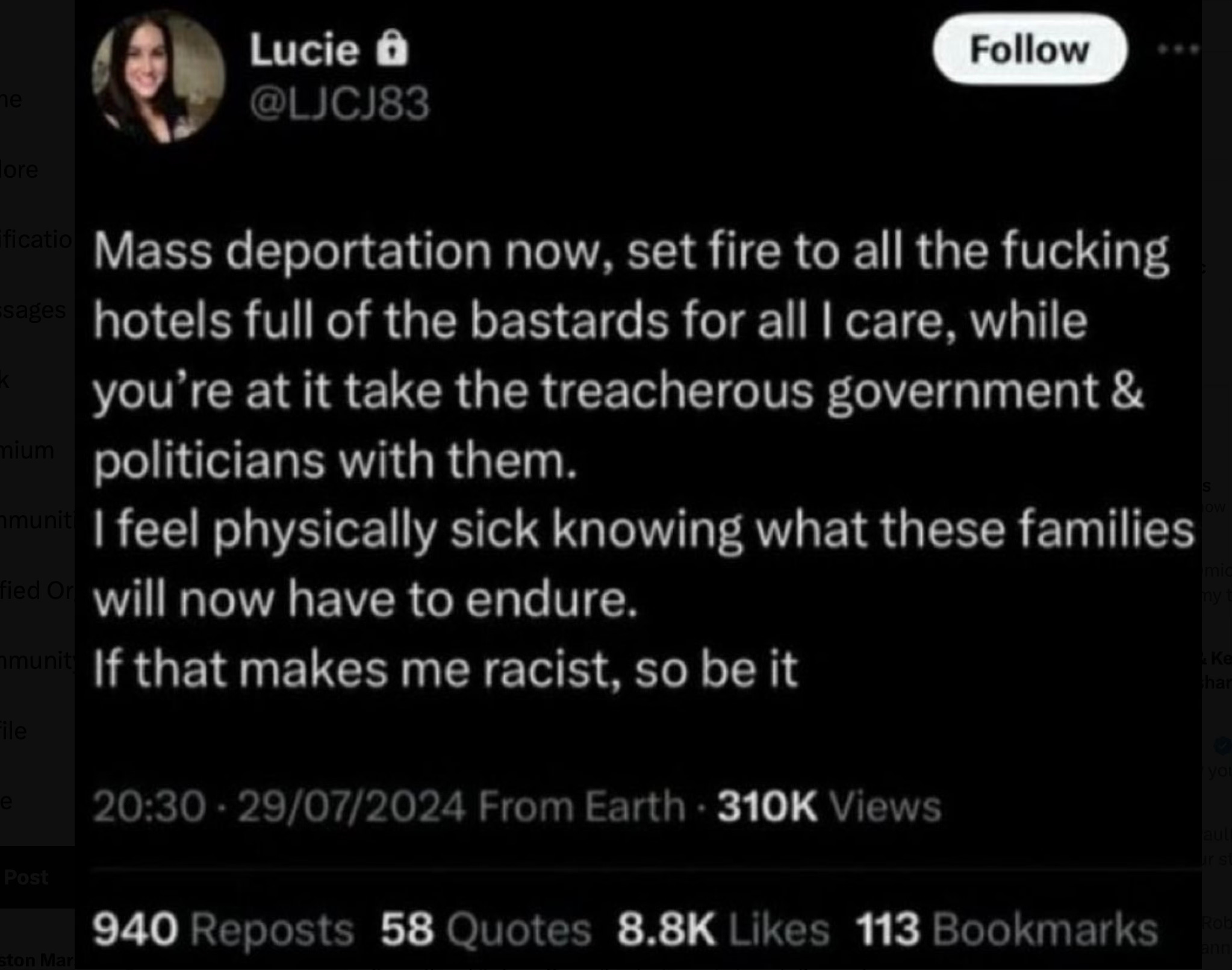 Lucy Connolly is the wife of a Conservative Party councillor currently serving a 31 month prison sentence for the following post on X: